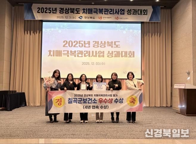 [ 신경북일보 ] 칠곡군 치매안심센터가 12월 3일 열린 ‘2025년 경북도 치매극복관리사업 성과대회’에서 우수상을 수상했다.