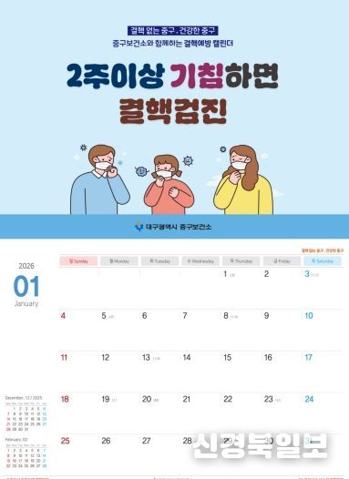 달력은 중구보건소에서 결핵 검진을 받는 65세 이상 주민에게 우선 배부되며, 이외에도 의료기관과 사회복지시설 등에도 순차적으로 전달될 예정이다. 중구보건소 1층 결핵실을 방문해 결핵 검진을 받은 어르신은 현장에서 달력을 수령 할 수 있다.