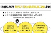 [ 신경북일보 ] 경주시는 시민의 독서문화 향상과 자기계발 기회를 제공하기 위해 ‘2025년 단석도서관 하반기 독서‧문화 프로그램’을 11월 16일부터 12월 17일까지 운영한다고 밝혔다. 이번 프로그램은 경주 시민을 대상으로 △커피의 역사, 향으로 만나다(성인) △도서관에서 만나는 공예(성인) △그림책과 함께하는 창의융합미술(7세~초등학생) 등 총 3개 강좌로 구성됐다. 성인 강좌는 주 1회씩 총 6회, 어린이 강좌는 주말 총 4회 운영되며, 단석도서관 2층 자료실 내 유아실에서 진행된다. 참여 신청은 10월 30일 오전 10시부터 경주시립도서관 홈페이지를 통해 선착순으로 접수하며, 수강료는 무료다. 단, 일부 재료비는 수강생이 부담한다. 자세한 내용은 경주시립도서관 홈페이지를 참고하거나 단석도서관으로 문의하면 된다.
