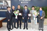 [ 신경북일보 ] 전주시의회 김성규(효자2·3·4동), 김정명(동서학,서서학,평화1·2동) 의원이 전주시의회 행정사무감사특별위원회가 뽑은 ‘2025 행정사무감사 우수위원’에 선정됐다. 12일 전주시의회는 남관우 의장과 김원주 운영위원장, 이남숙 행정감사특별위원장 등이 참석한 가운데 의장실에서 김성규, 김정명 의원에 대해 행정사무감사 우수위원 감사패 수여식을 가졌다. 행정사무감사특별위원회 소속 의원들은 최근 감사 활동이 우수한 의원 2명을 행정감사 우수위원으로 선정했다. 남관우 의장은 “두 의원이 행정사무감사에서 논리적인 정책 비판과 시정 전반에 대한 문제점 지적, 대안 제시 역할로 전주시 발전에 공이 많았다”고 평가했다. 지난달 18~26일 진행된 행정감사에서 김성규 의원은 실패한 드론축구월드컵, 무리하게 추진된 명품하천조성사업, 김정명 의원은 20억원 세금 날린 전주시 재활용시설 증설 취소, 장애인전용주차구역 과태료 개선 시급 등의 문제를 날카롭게 지적했다. 수상 의원들은 “시민의 뜻을 대변하는 의원으로서 당연히 해야 할 일을 했을 뿐인데 너무나 큰 상을 받게 된 것 같다”며 “전주