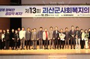 [ 신경북일보 ] 충북 괴산군은 29일 괴산군 문화예술회관에서 ‘제13회 괴산군 사회복지의 날 기념행사’를 개최했다고 밝혔다. 이번 행사는 괴산군사회복지협의회(회장 고명성) 주관으로 열렸으며, 송인헌 괴산군수를 비롯한 사회복지시설 종사자 등 200여 명이 참석한 가운데 사회복지인의 노고를 격려하고 화합을 다지는 자리로 마련됐다. 행사는 장연지역아동센터 합창단의 식전공연을 시작으로, 괴산군사회복지협의회 회장 이·취임식, 유공자 표창, 인사말, 퍼포먼스 순으로 진행됐다. 이날 이·취임식에서는 최은묵 전 회장에 이어 고명성 신임 회장이 취임했으며, 유공자 표창 수여식에서는 지역 사회복지 증진에 기여한 12명이 표창을 받았다. △군수 표창은 배기만(괴산지역자활센터), 이정자(성제노의집), 심서경(괴산재가복지센터), 이충정(괴산군노인복지관), 안미경(청천재활원), 천병주(수달지역아동센터), 이봉우(햇살재가복지센터), 이정민(괴산군 가족행복과) 등 8명이 수상했다. △군의장 표창은 신미경(괴산지역자활센터), 이만형(청천재활원) 등 2명, △괴산군사회복지협의회장 표창은 조경옥(청주사랑나눔기초푸드뱅크