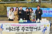 [ 신경북일보 ] 한국부인회 고령지회(회장 박경숙)는 11월 13일 오전 7시부터 지역 수능 시험장인 대가야고등학교 정문에서 수험생과 학부모들을 위하여 따뜻한 음료과 간식 꾸러미를 전달하며 수험생 격려 응원 봉사를 펼쳤다. 이날 한국부인회 회원들은 이른 새벽부터 정성껏 준비한 음료와 간식 꾸러미를 수험생 한 명 한 명에게 응원 메시지와 함께 건네며 그동안의 노력이 좋은 결실로 이어지기를 기원했다. 박경숙 한국부인회 고령지회장은 “그동안 쌓아온 노력과 열정이 오늘 좋은 결실로 이어지길 바라며, 긴장하지 말고 평소 실력을 충분히 발휘하길 바란다.”고 격려의 말을 전했다. 고령군(군수 이남철)은 “이른 새벽부터 수험생들을 응원하기 위해 정성을 다해 봉사해주신 한국부인회 고령군지회 회원 여러분께 깊은 감사를 드리며, 지역의 학생들이 그동안 쏟은 노력과 열정이 오늘 좋은 결실로 이어지길 진심으로 바란다.”고 말했다. 한국부인회는 여성 지위의 향상과 사회참여의 확대, 자원봉사활동을 통하여 복지사회 실현을 목적으로 설립된 최초의 여성단체이며, 한국부인회 고령지회는 1978년 발족되어 복지시설 목욕봉사, 막대인형
