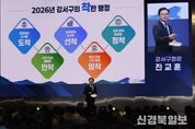[ 신경북일보 ] 진교훈 서울 강서구청장이 14일 “지역의 수많은 현안들을 하나하나 해결하면서 구민의 삶에 착! 다가가는 구정을 펼치겠다”고 강조했다. 진 구청장은 이날 오후 코엑스 마곡에서 열린 ‘2026년 신년인사회’에서 올해는 도전과 혁신으로 구민과 함께 성장하는 도약의 해가 될 것”이라며 이같이 말했다. 진 구청장은 ▲균형발전 도시에 도착 ▲안전‧안심 생활에 안착 ▲미래경제 도시에 선착 ▲복지‧건강 구민 곁에 밀착 ▲교육‧문화 일상에 정착 등 5가지 핵심전략을 제시하며 “구민이 일상에서 체감할 수 있는 착한 행정을 펼쳐나가겠다”고 재차 강조했다. 가장 먼저 제시한 과제는 고도제한 완화 신속 이행과 주거 환경 개선이다. 그는 ”고도제한 완화를 위한 밑그림은 그려졌지만 조기 시행과 강서구에 최적의 방안이 적용될 수 있도록 끊임없이 노력하겠다“며 ”지역 곳곳에서 추진 중인 재개발·재건축 등 정비사업들도 차질 없이 추진해 나가겠다“고 말했다. 또한, 대장홍대선 31년 개통, 강북횡단선 재추진 등을 통해 교통 인프라를 확충하겠다는 구상도 밝혔다. 이어 폭우, 폭설 등 자연재난