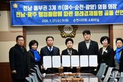 [ 신경북일보 ] 여수시의회는 27일 오후 3시 순천시의회 의장실에서 강형구 순천시의회 의장, 최대원 광양시의회 의장과 함께 '전남·광주 행정통합에 따른 전남동부권(여수·순천·광양) 미래경제동맹 공동선언문'을 발표했다. 이번 공동선언은 전라남도와 광주광역시의 행정통합 논의가 진행되는 가운데, 전남동부권이 국가 산업·에너지·물류 거점으로서 수행해 온 역할과 향후 기능이 통합 과정에서 반드시 반영돼야 한다는 데 3개 시의회 의장이 뜻을 모으며 마련됐다. 3개 시의회 의장은 공동선언을 통해 전남·광주 행정통합이 수도권 일극체제 완화와 국가균형발전을 위한 계기가 돼야 하며, 단순한 행정구역 개편을 넘어 산업·교통·에너지·물류·인재 정책을 연계하는 초광역 경제권 형성으로 이어져야 한다는 점을 강조했다. 아울러 행정통합 이후 정책과 재정, 대규모 국책사업이 광주권과 전남 서부권에 집중될 가능성에 대해 우려를 표하며, 전남동부권의 산업적 위상과 기능이 통합 논의 전반에 균형 있게 반영돼야 한다는 입장을 분명히 했다. 여수·순천·광양 3개 시의회 의장은 공동선언을 통해 ▲전남동부권의 국가산업 거점 기능과 잠재력을