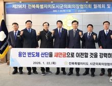 [ 신경북일보 ] 전북특별자치도시군의회의장협의회(회장 남관우 전주시의회 의장)는 22일 군산시의회에서 열린 제296차 월례회에서 새만금을 중심으로 한 국가산업 전략 전환을 촉구하는 3건의 건의안을 가결했다. 이날 협의회는 군산시의회 김우민 의장이 제안한 ‘새만금 국가산업단지 RE100 산업단지 지정 촉구 건의안’과 진안군의회 동창옥 의장이 제안한 ‘용인 반도체 국가산단의 새만금 이전 촉구 건의안’, 부안군의회 박병래 의장이 제안한 ‘새만금 7공구 산업용지 전환 및 RE100 국가산업단지 지정 촉구 건의안’을 채택하고, 정부에 적극적인 정책 전환을 촉구했다. 협의회는 ‘새만금 국가산업단지 RE100 산업단지 지정 촉구 건의안’과 관련해 “글로벌 탄소 규제 강화와 EU 탄소국경조정제도(CBAM) 시행으로 재생에너지(RE100) 사용이 수출기업의 필수 조건으로 자리 잡고 있다”며 “대규모 태양광·해상풍력 조성 여건과 스마트그린 국가시범산단, 이차전지 특화단지 등 기반을 갖춘 새만금은 RE100 산업단지 조성을 위한 최적지”라고 RE100 산업단지 지정을 촉구했다. ‘용인 반도체 국가산단의 새만금 이전 촉구 건의안’