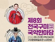 [ 신경북일보 ] 구미문화예술회관 소공연장에서 (사)경북판소리진흥회가 주관하는 '2026 전국시니어국악한마당'이 3월 21일 오후 4시에 열린다. 행사는 식전과 본 공연으로 나뉘어 진행된다. 식전무대에서는 '단아한 국악단'이 '풍악을 올려라' 공연으로 분위기를 띄운다. 본 공연에서는 윤진철(국가무형유산 판소리 적벽가 보유자), 김영화(제32회 목포전국국악경연대회 명창부 대통령상 수상자), 임현빈(국가무형유산 흥부가 이수자) 등 국내 대표 명창들이 무대에 오른다. 고수 권혁대, 신문범 등도 함께 참여해 '심청가', '수궁가', '적벽가' 등 판소리 다섯 바탕의 주요 대목을 선보인다. 이소정 명창(고아읍 출신)은 '흥보가', '춘향가'를 직접 공연하며, 지역가수 채한길과의 특별 무대도 준비돼 있다. 김장호 구미시장은 이번 공연에 대해 "명창들의 깊이 있는 소리와 특별 협연이 어우러지는 품격 있는 공연이 될 것"이라며, "시민들이 전통문화의 매력을 가까이에서 느끼고, 시니어 세대의 문화활동도 더욱 활발해지는 계기가 되길 기대한다"고 밝혔다.