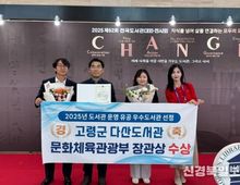 [ 신경북일보 ] 고령군 다산도서관이 ‘2025년 도서관운영유공 우수도서관’으로 선정되어 문화체육관광부 장관표창을 수상했다. 시상식은 10월 22일 오후 2시 30분 경기도 수원컨벤션센터에서 개최됐으며, 문화체육관광부가 주최하고 (사)한국도서관협회가 주관했다. 이번 시상식은 공공‧작은‧학교‧병영‧교정시설‧전문도서관 등 전국 2만 2천여 개 도서관 중 우수 운영기관을 선정하여 포상하는 자리로, 고령군 다산도서관은 지역사회 독서문화 진흥과 평생학습 활성화에 기여한 공로를 인정받았다. 다산도서관은 어린이‧청소년‧성인 등 전 세대를 아우르는 맞춤형 독서문화 프로그램과 3년간 8건의 공모사업으로 도서관 운영비를 증가시켰으며, 특히 ‘찾아가는 도서관, 책 읽어주세요.’, ‘시민작가 양성’등 지역과 함께하는 생활문화 플랫폼으로 자리매김하하여 생활 속 평생학습 거점 조성 등 지역 특성을 살린 적극행정 운영으로 높은 평가를 받았다. 이날 시상식에는 고령군 가족행복과장 및 담당직원들이 참석하여 다산도서관의 수상 영예를 함께했다. 고령군수는 “이번 장관표창은 군민과 함께 도서관을 성장시켜 온 결과이며,