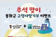[ 신경북일보 ] 봉화군은 민족 최대의 명절인 추석을 맞아 고향사랑기부제에 대한 홍보와 기부문화 확산을 위해 오는 9월 29일부터 10월 19일까지 경품 이벤트를 실시한다. 이벤트 기간 중 봉화군에 건당 10만 원 이상 기부하고 답례품까지 선택을 완료한 선착순 100명에게는, 배달의민족 2만 원권 기프티콘 또는 1만 원 상당의 커피 상품권을 랜덤으로 증정할 예정이다. 경품 추첨 결과는 10월 24일 개별 통보된다. 또한 이벤트 기간 중 오는 10월 16일부터 19일까지 열리는 ‘봉화송이축제’ 행사장 내 고향사랑 홍보 부스를 방문해 현장 기부에 참여하면 봉화사랑상품권 2만원을 추가로 지급한다. 다만, 동일인이 이벤트에 중복 참여할 경우 혜택은 제한된다. 금대원 재정과장은 “고향을 생각하는 따듯한 마음이 모여 봉화의 미래를 밝히는 큰 힘이 될 것이다.”면서 “이번 추석에는 가족과 함께 나눔과 기부의 의미를 되새기며 고향사랑 기부에 동참해 주시기를 바란다.”라고 말했다. 한편, 고향사랑기부금은 ‘고향사랑e음’ 누리집이나 전국 농‧축협 영업점을 방문해 기부할 수 있다.