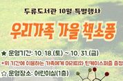 [ 신경북일보 ] 대구두류도서관은 10월 18일부터 31일까지 어린이실에서 선착순 40가족을 대상으로 책과 소풍 물품을 함께 대여하면 머리띠와 퍼즐을 증정하는‘우리가족 가을 책소풍’행사를 실시한다. 참여를 원하는 가족은 어린이실에 방문하여 도서관 회원증을 제시하고 책과 돗자리, 간이의자, 미니테이블, 독후활동지, 보드게임 등 소풍에 필요한 물품을 대여하고 당일 오후 5시까지 반납하면 된다. 기타 자세한 내용은 도서관 누리집 또는 어린이실로 문의하면 된다.