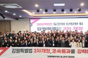 [ 신경북일보 ] 강원특별자치도 범국민추진협의회(협의회장 최양희, 추진단장 김천수)가 11월 21일 11시, 춘천 스카이컨벤션 2층 컨벤션홀에서 강원특별법 3차개정 조속 통과 촉구 결의대회를 개최했다. 당초 정기총회를 개최할 예정이었으나 어제(11월 20일) 국회 행정안전위원회 법안소위에서 강원특별법 3차 개정이 논의가 불발되자 긴급 행동에 나섰다. 이날 결의대회에는 범추협 위원들을 비롯해 고문직을 맡고 있는 김진태 도지사, 김시성 도의회 의장 등 200여 명이 참석하여 조속 통과를 촉구하는 목소리를 높였다. 최양희 협의회장은 “오늘은 강원특별자치도의 성과를 함께 축하하는 날이 돼야 했지만, 어제 행안위에서 3차 개정을 또 미루는 바람에 오히려 우리의 결의를 더 크게 보여줘야 하는 날이 됐다”라며, “각 지역에서 올라오신 위원 여러분의 지혜와 네트워크가 어느 때보다 절실하다”라고 말했다. 김진태 강원특별자치도지사는 “3차 개정안이 처음 국회에 올라간 게 작년 9월인데, 1년이 넘도록 단 한 번도 심사를 하지 않았다”라며, “5극 3특을 강조하면서 특별자치도 법은 시간이 없다고 국회 심사가 미뤄지는 것이 현