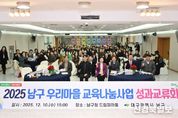 [ 신경북일보 ] 대구 남구는 지난 11일 2025년 남구 미래교육지구 성과공유회 및 실무협의회를 성황리에 개최했다고 밝혔다. 민-관-학 경계없는 교육 네트워크 활성화를 위해 개최된 “2025년 남구 미래교육지구 성과공유회 및 실무협의회”는 1부: 성과 발표 공연, 2025년도 사업 보고 및 2026년도 사업에 대한 의견 수렴 “남구 미래교육지구에 바란다.” 및 2부: 사업별 우수사례 발표 공유(5건) 순서로 진행됐다. 조재구 남구청장, 송민선 남구의회 의장, 문경진 대구시 교육청 장학관을 비롯해 관계 기관, 사업 담당자, 청소년, 관내 학교장 및 교사 등 90여 명이 참석하여 2025년 사업을 되돌아보고 내년도 사업 준비를 위한 의견 교류가 활발히 이루어졌다. 2020년 대구광역시교육청 미래교육지구 공모 사업에 지정되어 지속적으로 이어져오고 있는 남구 미래교육지구 사업은 마을 유휴공간을 활용한 마을 학교(2개소), 지역 특성을 반영한 다양한 체험형 교육 지원 남구 다:행마을학교, 지역 자원 앞산을 활용한 뚜벅뚜벅 앞산 숲 탐험, 교과 연계 기초 학습 능력 향상을 위한 문해/금융/천문 캠프 등 11개의 세부 프