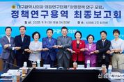 [ 신경북일보 ] 대구시의회 의원연구단체 ‘대구미래혁신포럼’(대표 이재숙 의원)은 9월 9일, 시의회 3층 회의실에서 소속 의원들이 참석한 가운데 정책연구용역 최종 보고회를 개최했다. 이날 보고회에서는 김태우 의원(수성구5)이 제안한 '광역·기초자치단체 청년정책 연계 활성화 방안 연구'와 김재용 의원(북구3)이 제안한 '공공 파크골프장의 운영 효율화를 통한 활성화 방안 연구' 등 총 2건의 과제가 발표됐으며, 각 과제를 수행한 연구진, 대구미래혁신포럼 소속 시의원, 대구시 관계자 등이 참석했다. 첫 번째 연구 발표자인 대구정책연구원 박경숙 부연구위원은 지방자치단체 간 공동 이슈 발굴과 청년 참여 기반의 공동 기획·집행, 제도 정비와 협력 거버넌스 체계화를 위한 정책 방향을 제시했다. 특히 연구 수행 과정에서 기초의원, 청년정책 담당 공무원, 청년센터장을 대상으로 세미나 및 간담회를 개최해 현장의 애로사항과 협업 아이디어를 폭넓게 수렴했고, 그 의견을 최종 보고서에 반영했다. 청년정책 연구를 제안한 김태우 의원은 “지역 청년정책의 실효성을 높이기 위해서는 청년 수요에 기반한 광역자치단체와 기초자치단체