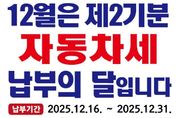 [ 신경북일보 ] 안동시는 2025년도 제2기분 자동차세 40,428건, 62억 7천만 원을 부과하고 고지서를 발송했다고 12월 18일(목) 밝혔다. 12월 1일 현재 자동차등록원부상 소유자에게 부과된 이번 자동차세의 납부 기간은 12월 16일부터 12월 31일까지며, 연납신청으로 자동차세를 이미 납부한 차량 및 6월에 납부한 연세액 10만 원 이하인 차량은 이번 부과대상에서 제외된다. 하반기 중 신차를 구입하거나 중고차를 이전받아 등록한 경우에는, 취득일부터 12월 말까지 소유한 기간에 대해 일할 계산된 금액을 납부하면 된다. 자동차세 연납은 매년 1․3․6․9월에 신청할 수 있으며, 1월 중에 신청할 경우 4.58%의 공제를 받을 수 있고, 신청은 안동시청 세정과 및 읍면동 행정복지센터 방문 또는 전화, 위택스로 가능하다. 자동차세는 고지서에 기재된 지방세입 계좌를 통해 전국 모든 금융기관에서 이체 수수료 없이 납부할 수 있고, 지로 및 현금인출기 납부, 위택스 등을 통한 전자납부도 가능하다. 안동시 관계자는 “우편으로 발송된 고지서를 반드시 확인하시고 가산금, 차량 압류 등의 불이익이 발생하지