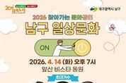 [ 신경북일보 ] 대구 남구가 지역민의 문화 체험 기회 확대와 예술인 공연 지원을 목적으로 '2026 찾아가는 문화공연'을 마련했다. 이번 공연은 신규 입주 아파트 단지를 대상으로 희망 단지를 선정해 진행된다. 첫 행사는 4월 14일 저녁 7시, 앞산비스타동원 아파트에서 열린다. 사회는 개그맨 김재롱이 맡고, 가수 이새벽과 미스트롯 4 출연자 장혜리가 무대에 오른다. 앞산비스타동원 아파트 입주 이후 처음 마련된 주민 참여 행사로, 입주자 대표회도 경품과 선물을 준비해 주민 간 교류의 장을 마련한다. 조재구 남구청장은 "대규모 행사도 중요하지만, 가까운 곳에서 주민들이 쉽게 문화예술을 접할 수 있도록 하겠다"며 "아파트 음악회를 통해 일상 속에서 소소한 행복을 느끼길 바란다"고 말했다. 공연 관련 문의는 남구 문화관광과 문화예술팀에서 안내한다.